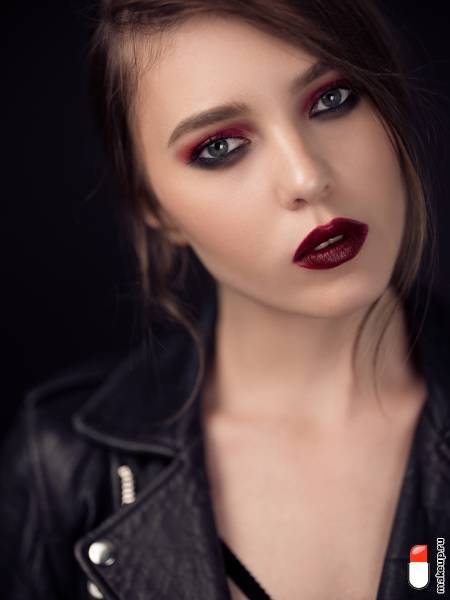 Еще один агрессивный вариант мейкапа с яркими губами, который характеризует поклонников тяжелой музыки. Глаза подводятся тонкой линией, тени наносятся небрежно и слегка выходят за границу века.