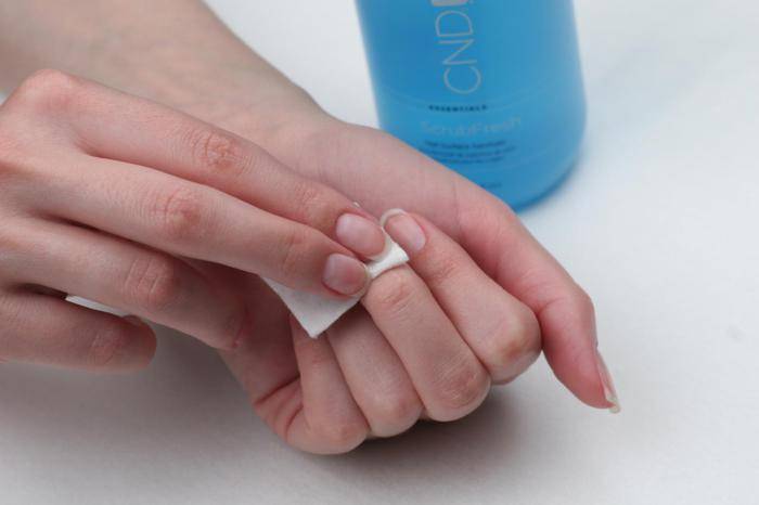 Снимаем пыль и обезжириваем ноготь с помощью специально средства для обезжиривания и снятия липкости с ногтей. Проводим все манипуляции при помощи безворсовых салфеток для маникюра.