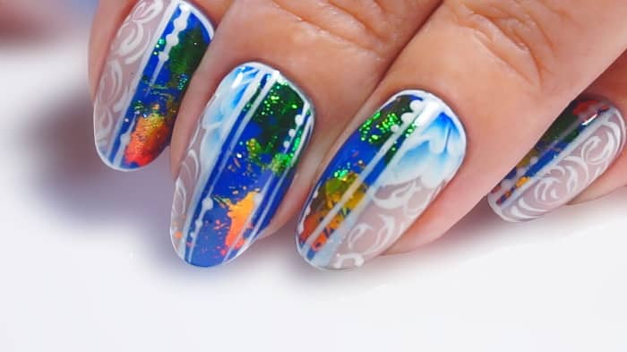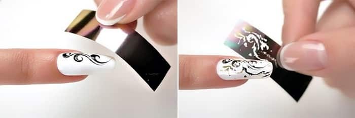 Существует и специальная фольга, которая наносится гель-лак без липкого слоя или обычный высушенный лак. Чтобы получить рисунок на ноготках, стоит приклеить фольгу, прогладить сверху и аккуратно снять. Рисунок, что был сформирован на фольге, окажется на ногте.