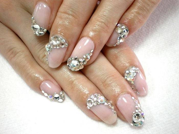 Линию на свободном крае ногтя можно прорисовать стразами или крупными пайетками. В один ряд и более — это зависит от площади свободного края ногтя и размера страз
