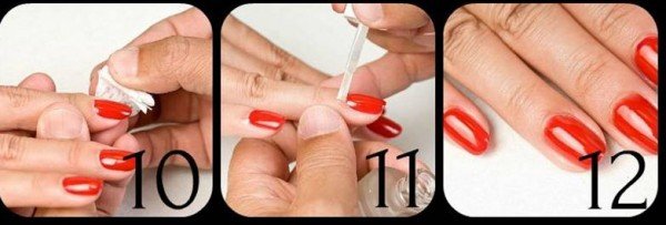 Обратите внимание на то, что лаком необходимо покрыть не только пластинку ногтя, но и её срез, запечатав таким образом торец