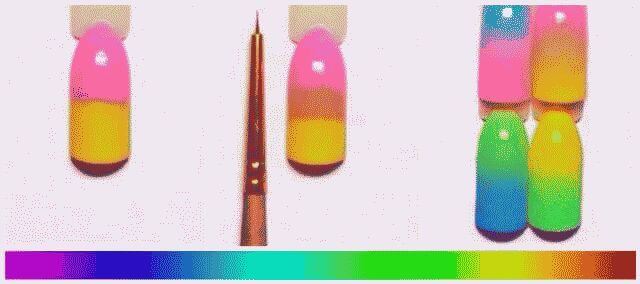 Цвета для градиентного маникюра выбирают аналогичные или контрастные, чтобы лучше был заметен рисунок.