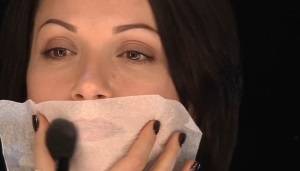 Затем вам потребуется обычная салфетка. Ее нужно приложить к губам, а после сверху припудрить губы или присыпать их румянами.