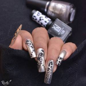 Существует множество разных способов применения ее для дизайна ногтей. У каждого мастера есть и парочка своих секретов. Применение для кракелюрного маникюра заключается в приклеивании фольги, но не на всю поверхность ногтя (как, к примеру, для зеркального маникюра), а только на некоторые его участки. Промежутки между ними и играют роль трещинок, через которые проглядывает нижний слой.