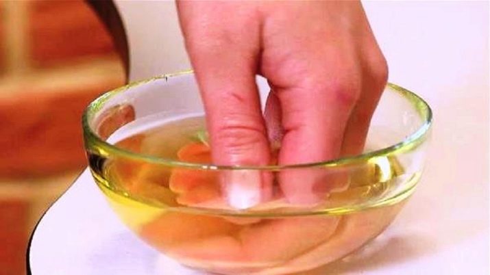 Для приготовления такого средства нужно в половину стакана чая добавить 10 граммов масла оливы. В эту смесь надо поместить пальцы и подержать их так в течение 25 минут. После этого нужно их вытянуть и легонько промокнуть бумажным полотенцем.