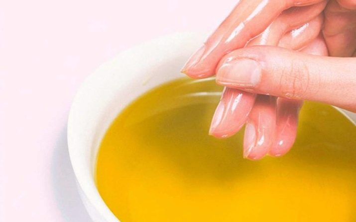 Можно использовать ванночку с любым растительным маслом. Для этого понадобится 120 граммов выбранного масла, которое необходимо немного разогреть на водяной бане. К нему можно добавить несколько капель йода и несколько капель жидкого глицерина. В эту смесь нужно погрузить полностью пальцы и посидеть так 25–35 минут. После окончания процедуры не стоит сразу мыть руки, их надо просто промокнуть салфетками. Такая ванночка поможет укрепить ногти.