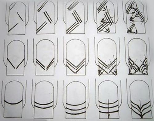 Линии наносятся по диагонали ногтя. Первую линию рисуют простую. Вторую, параллельно ей, с утолщением, идущем с середины линии. Похоже на очень узкий треугольник. Третью линию рисуют простую вдоль предыдущей. Четвертую рисуют с утолщением уже с другой стороны. Пятую – простую.