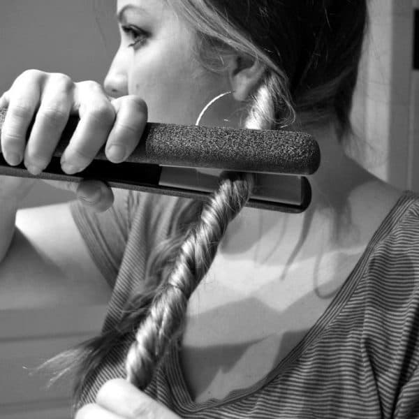 - Плойкой, предварительно разогретой до температуры 280 градусов, легко проведите по косичкам. Проделайте это несколько раз.