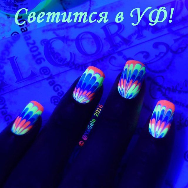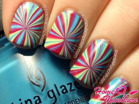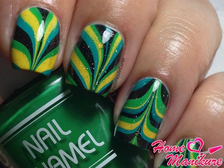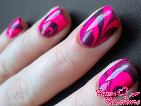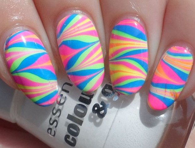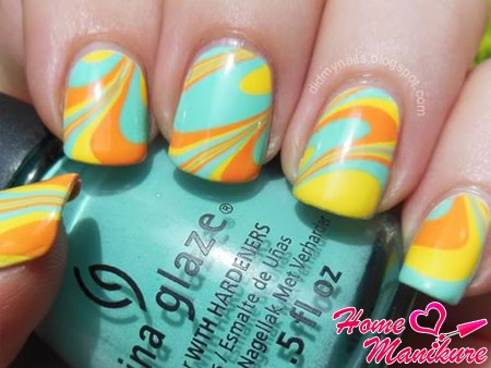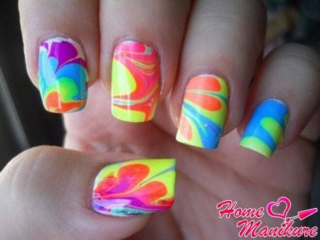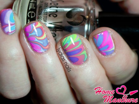 Декор на воде с использованием ярких оттенков смотрится очень интересно и оригинально. Необычные краски придадут вашему образу очарование. Водный маникюр позволяет каждой моднице ощутить себя художницей и создать свой неповторимый дизайн ногтей.