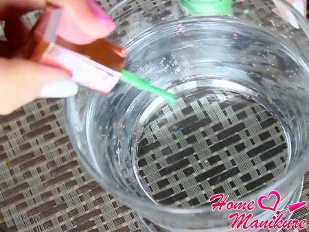 - Палец лучше пару секунд подержать в воде, затем палочкой убрать остатки лака на поверхности и перевернуть ноготь.
