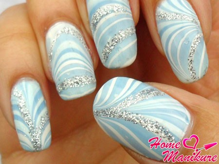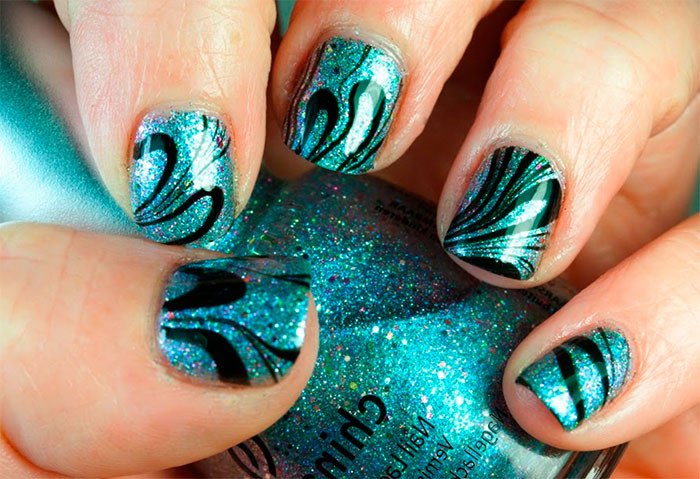 Черно-белый водный маникюр прекрасно сочетается с классическими нарядами. Техника выполнения этого дизайна проста, с помощью зубочистки мы делаем несколько завитков на воде. Для украшения этого маникюра можно добавить мелкие серебристые блестки.
