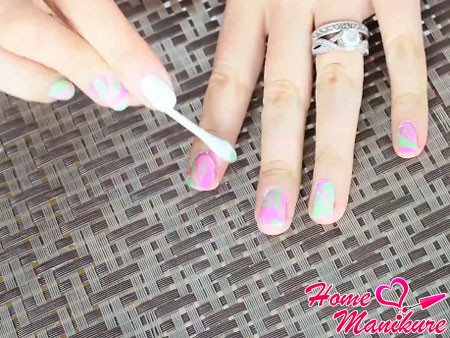 - Для создания подобного дизайна лучше всего подойдут жидкие лаки. Если ваш лак устарел, не стоит разбавлять его растворителями, иначе и лак испортится, и маникюр не получится.