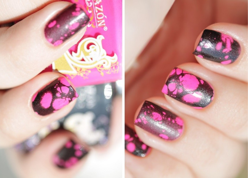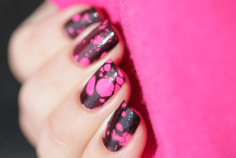 Этот вид водного маникюра является самым популярным в 2017 году. Для его выполнения нам необходимы яркие неоновые лаки (лимонный, малиновый, салатовый и оранжевый), для базовой основы – белый и черный лак (для горошин), а также любой спрей.