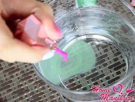 Приоткройте все баночки с цветным лаком и подготовьте простые зубочистки. Предположим, что вы решили сделать маникюр в двух тонах. Откройте первый лак и поднесите кисточку над стаканом на расстояние не дальше 2 см. Капелька должна упасть в воду. Вы увидите, как лак растекается. Возьмите второй цвет и капните в центр получившегося развода. Повторите 6-8 раз, поочередно меняя лаки.