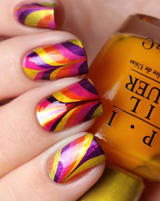 Яркий летний маникюр, подойдет к любому наряду и подчеркнет ваш задорный образ. Для создания пестрого водного маникюра вам необходимо немного фантазии и самые яркие лаки!