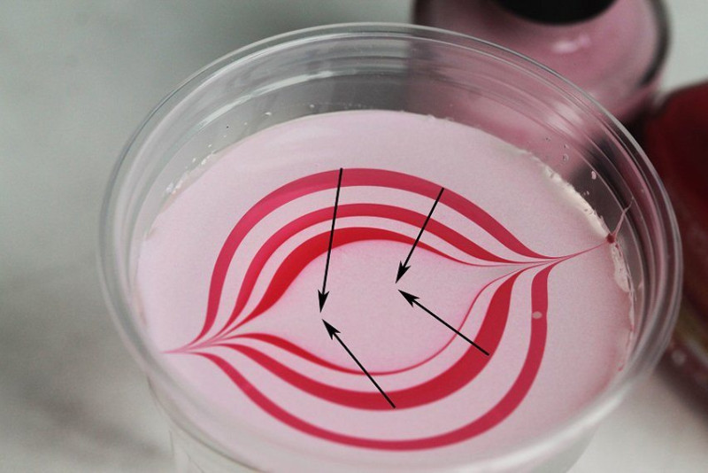 Каждый водяной круг должен растекаться к стенкам стакана. Вы можете помочь этому процессу, проводя зубочисткой от первого развода к бортику емкости. Не погружайте палочку слишком глубоко, она должна скользить по воде.
