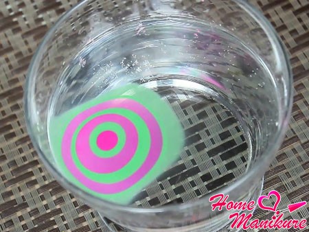 Когда водный узор будет готов, плавно опустите ноготь в разноцветную радугу параллельно плоскости стола. Пальчик должен полностью погрузиться в жидкость. Зубочисткой быстрыми скручивающими движениями соберите лишний лак с поверхности воды