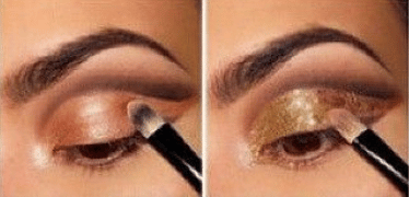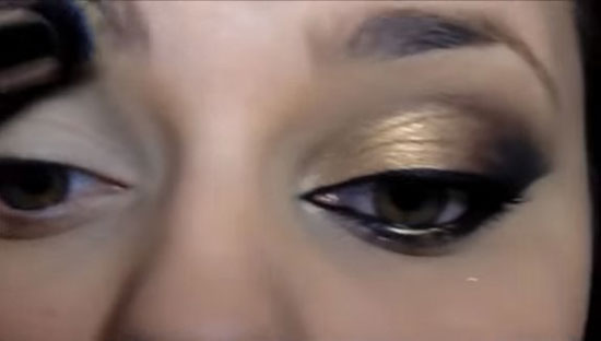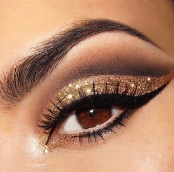 Покройте всё верхнее веко жидкими тенями цвета бронзы и добавьте золотых блесток.