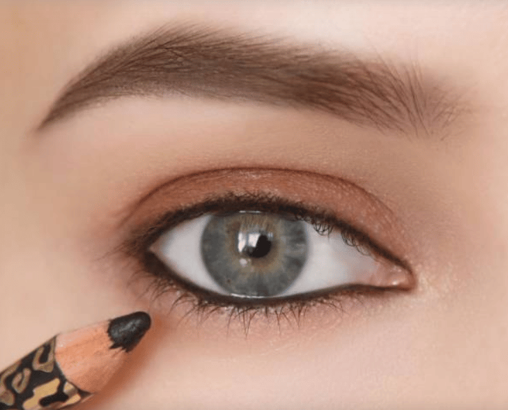 - На всю поверхность подвижного века наносим тени светлых тонов, после растушевываем. На нижнее веко наносим белые тени или же белый карандаш, так вы визуально сделаете глаза больше. Теперь приступаем к нанесению линии подводки, если вы уверенно пользуетесь жидкой подводкой, то рисуйте линии ею. Если же вы не имеете навыков, то вооружитесь черным контурным карандашом. Линия подводки на верхнем веке повторяет линию роста ресниц, на нижнем веке на располагается ниже линии роста ресниц. Именно за счет такой подводки, вы получите огромные глаза. Линии контура верхнего и нижнего века необходимо соединить за внешним краем век, соединение должно напоминать хвост ласточки. С помощью темных теней прорисовываем складку меж подвижным и неподвижным веком, эта линия достигает переносицы, после этого растушевываем ее по направлению вверх коричневыми тенями. Низ линии нужно подчеркнуть полоской светлого оттенка теней, потом соединяем ее с бежевым покрытием на верхнем веке, производим маскировку тональных переходов.