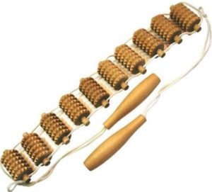 ручной деревянный массажер с ручками и вращающимися роликами помогает снять усталость и мышечное напряжение;
