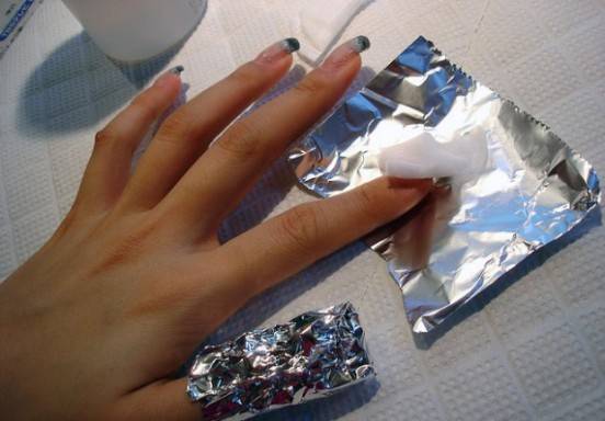 После того как задача по удалению будет выполнена, нужно увлажнить диски ацетоном или другим соответствующим средством и укрыть ими весь ноготь, после чего обернуть отрезом из фольги. Укрывной слой из фольги поможет задержать улетучивающиеся вещества, которые отвечают за растворение акрила. В таком состоянии ногти следует подержать около получаса. По прошествии времени акрил изменит свою консистенцию и станет желеобразным