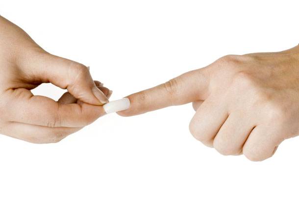 Держите поблизости ватные диски, смоченные в ацетоне, чтобы периодически протирать ноготь. Если во время спиливания сложно отличить искусственное покрытие от натурального, постучите по ногтю, гель отличается жёсткостью.