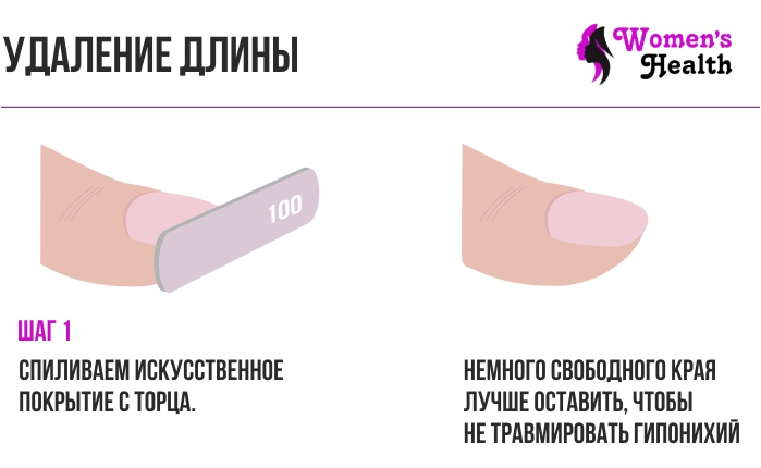 Инструкция, как в домашних условиях снять нарощенный ноготь, такая: