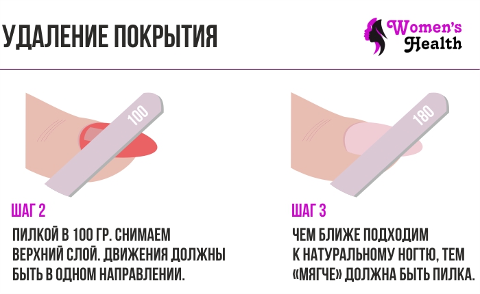 Снятие. Пилочкой с абразивностью 80*100 спиливайте поверхность ногтя резкими горизонтальными движениями. Чтобы не перестараться и не срезать родной ноготь удаляйте образовавшуюся пыль, так будет лучше видно ногтевую пластину.