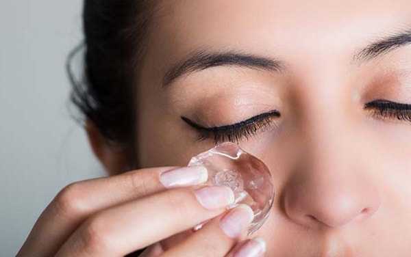 После плача, обильных слез нужно обработать льдом область вокруг глаз – верхние и нижние веки, выполняя движения от переносицы к внешнему уголку глаза. Прилагать усилия, сильно тереть и надолго задерживать кубик льда на одном месте нельзя.