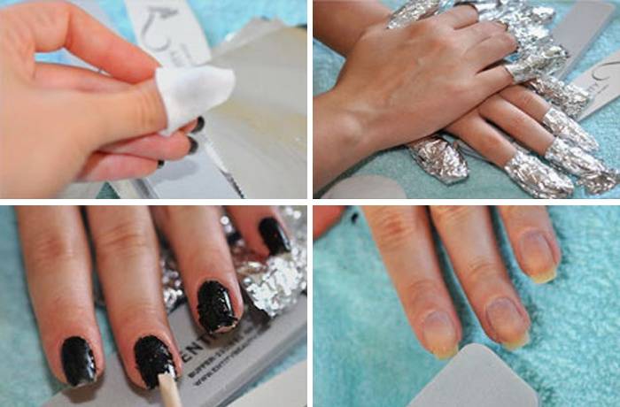 - Размачиванием после спиливания топа вручную. На ногти помещают пропитанные ремувером кусочки ваты или салфетки, обертывают фольгой и выдерживают положенное время. После этого утративший твердость и адгезию шеллак убирают палочкой.