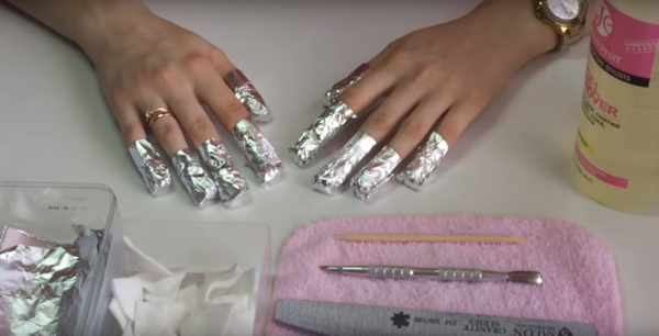 Расходные материалы: ватные диски и фольга (10 пластин), жидкость для снятия, палочка или лопатка. И засекайте время. Оптимальное – 10 минут.