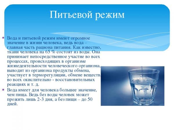 Правильный питьевой режим является ингредиентом в программе увлажнения кожного покрова. Вода встречается в организме человека в составе межклеточной жидкости, она является первым составляющим компонентом коллагена, на водной основе находится гиалуроновая кислота, от которой зависит упругость эпидермиса.