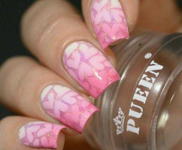 Дизайн с сердечками получится невероятно нежным, если вы дополните его модной техникой омбре в пастельной палитре.