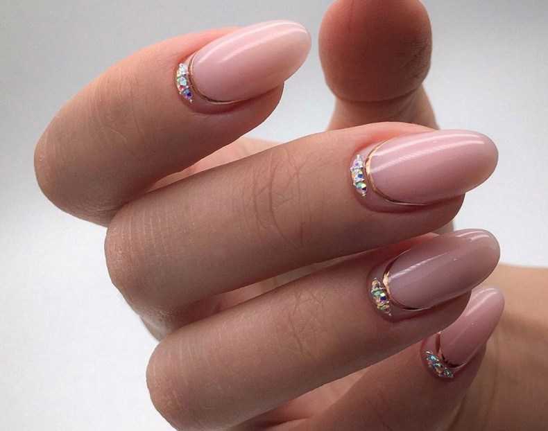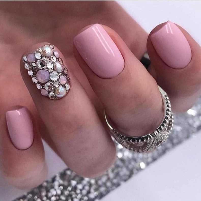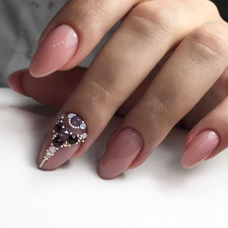 Нежный вариант: сделать нюдовый маникюр (выбрать для фона нежно-розовый или бежевый цвет), а на безымянном выложить из страз разных размеров сердечко. А можно уже купить камушки в форме нужного вам символа — это упростит вам задачу в создании романтического нейл-арта.