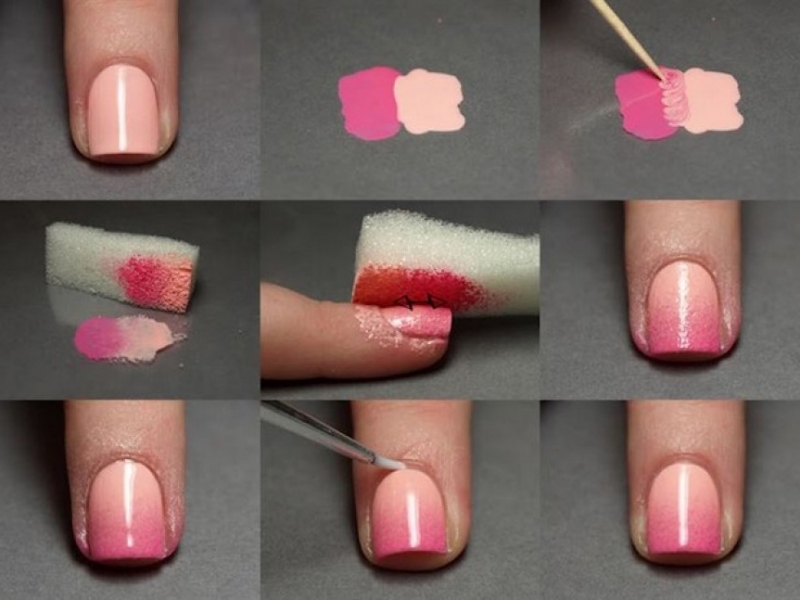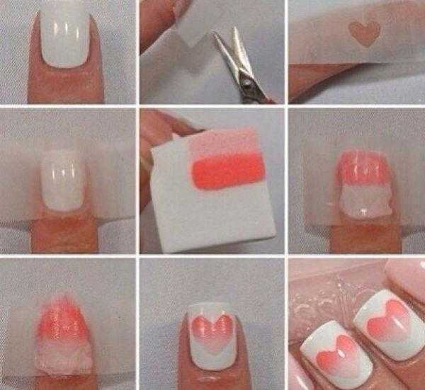 Использовать трафарет: возьмите бумажный скотч, согните его пополам (с не клейкой стороны) и вырежете сердечко. В данном случае, трафарет используется для создания милого сердечка в стиле «омбре», подробнее о градиентном маникюре читайте здесь.
