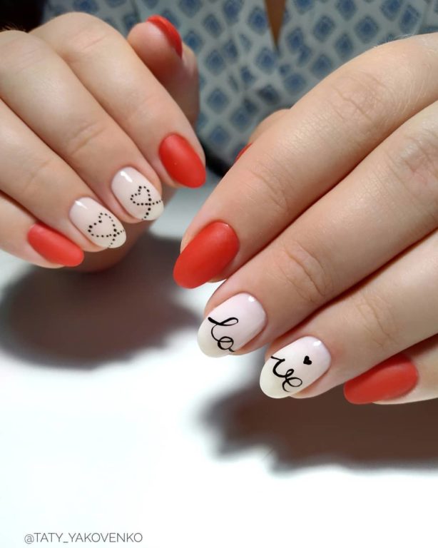 В 2024 матовый дизайн остается на лидерских позициях. Яркое блестящее сердечко на матовой основе — стильно, модно и очаровательно. Вы можете поиграть с текстурами и сделать яркое глянцевое сердечко на матовой основе. Для маникюра лучше выбирать контрастные оттенки лака, но эффектно будет смотреться и дизайн с использование близких оттенков лака.