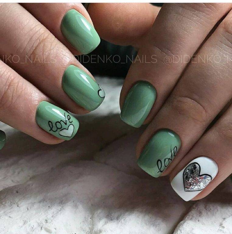 Красиво будет смотреться темно-зеленый маникюр. Такой интересный цвет используйте для фона, зону улыбки прокрасьте золотым лаком, а на нескольких пальчиках дорисуйте этим же цветом символ любви и нежности.