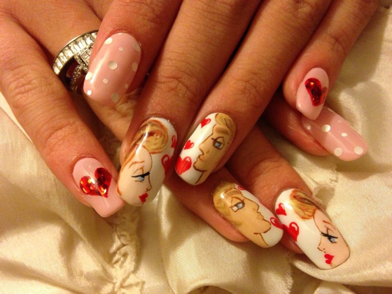 Вот такой вариант маникюра на день Святого Валентина предлагает Ольга Бессонова. Этот дизайн ногтей выполнен по мотивам иллюстраций на вкладышах очень популярной в 90-е годы жевательной резинки Love is.