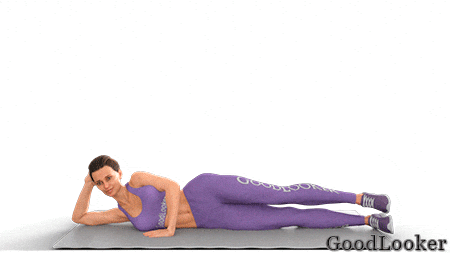 Лежа левым боком на коврике положить голову на кулак согнутой левой руки, ладонь правой положить на локоть левой. С максимальной амплитудой сделать 20 махов правой ногой. Перевернуться на другой бок и повторить махи левой ногой.