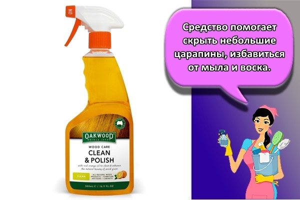 Это натуральное средство для очищения дерева, которое способствует удалению загрязнений. В составе присутствуют масла апельсина и сои. Средство помогает скрыть небольшие царапины, избавиться от мыла и воска. Также оно формирует защитную пленку.