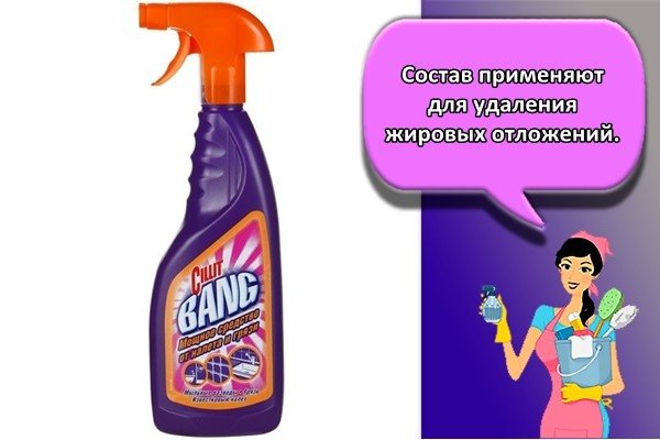 Состав применяют для удаления жировых отложений. Он помогает убрать масляные пятна и застарелую грязь. Вначале составом стоит обработать шкафы, после чего подождать 5 минут и смыть вещество водой.