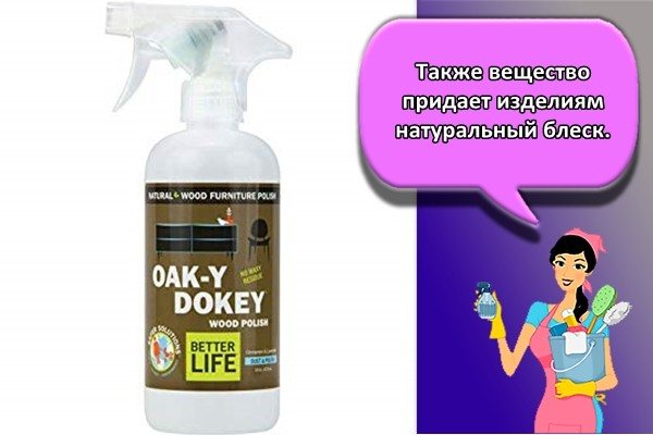 Это средство включает смесь натуральных масел. Они способствуют очищению и защите деревянной мебели. Также вещество придает изделиям натуральный блеск. Состав отличается безопасностью и успешно справляется с пылью и загрязнениями.