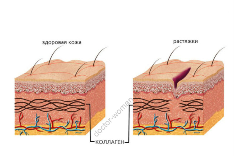 Разрывы кожи начинают замещаться соединительной тканью, которая не содержит волокон коллагена и эластина, но пронизана капиллярами, поэтому на начальном этапе появления растяжек они имеют яркий розовый, лиловый, синеватый или даже фиолетовый цвет, в зависимости от величины разрыва.