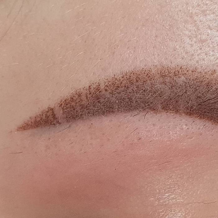 Сами брови выглядят излишне четкими и яркими. Это связано с тем, что мастер намеренно вводит больше пигмента, зная о том, что часть его в первые дни выйдет с сукровицей. Если процедуру проводил опытный мастер, то не стоит опасаться чрезмерной насыщенности цвета, после заживления пудровые брови будут выглядеть более естественно.