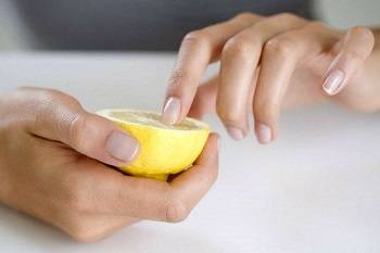 - Берётся лимонная цедра, которой в течение нескольких минут массируется ногтевая пластина. Потом нужно вымыть руки холодной водой и нанести любой питательный крем. Лимонный сок не только укрепляет, но и отбеливает ногтевую пластину. Применять данное средство для укрепления ногтей рекомендуется не чаще, чем раз в неделю, так как лимонный сок оказывает агрессивное действие.