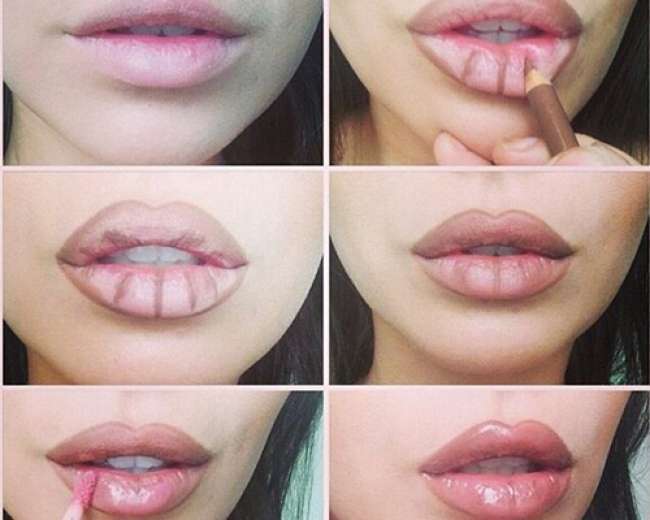 Этот макияж для увеличения объема губ технически наиболее сложный. Он может кардинально изменить форму ваших уст, но будьте готовы к тому, что с первого и даже с третьего раза может не получится безупречно. Но потренировавшись, этот макияж губ, увеличивающий объем, может сделать вас обладательницей самых сексуальных уст. Пошагово инструкция его исполнения выглядит следующим образом: