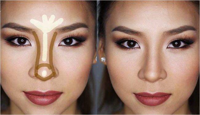 Один из самых часто задаваемых профессиональным визажистам вопросов – как уменьшить нос с помощью макияжа. В этом случае коррекция носа темным оттенком начинается непосредственно от складки верхнего века и плавно переходит в прямую параллельную носу. Темные линии продолжаются вплоть до самого кончика носа и соединяются между собой по верхней границе ноздрей. Затемнению также подвергаются и крылья носа.