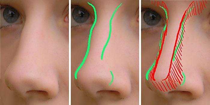 Не всех горбинка этой части тела приводит в восторг. Чаще девушки пытаются любыми способами от нее избавиться. Для того чтобы она не искривляла форму и не вносила дисгармонию в ваш образ, понадобится несколько минут времени и светлый тональный крем (на пару тонов светлее вашего цвета кожи). Средство наносится на кончик и по бокам, а саму горбинку тонируют более темным кремом.