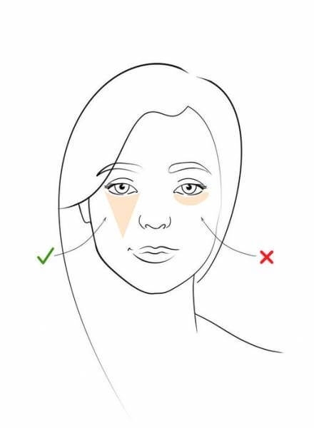 Тон накладывается на наружный и внутренний уголки глаз, а затем растушевывается по направлению к внешней зоне, затем на скулу движениями «вверх», «вниз».