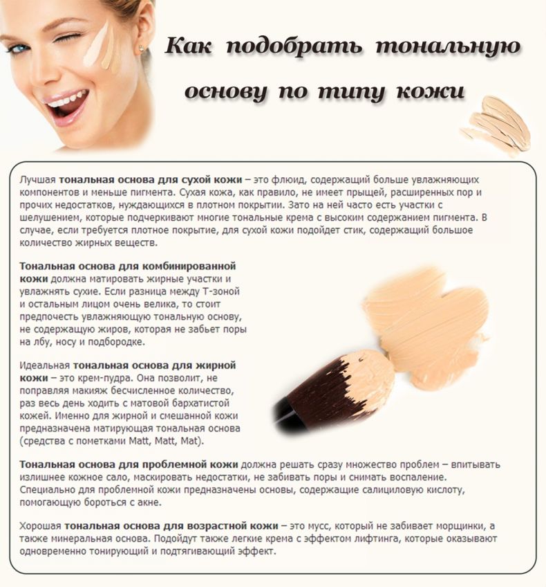 Всегда выбирайте тональное средство, которое сможет улучшить ваш тип кожи. Безмасляные формулы лучше всего подходят для кожи, склонной к прыщам, увлажняющие формулы хорошо подходят для нормальной и сухой кожи, а гипоаллергенные крема идеально подойдут чувствительной коже.